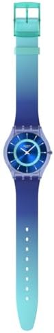 This ultra-thin watch has a sun-brushed blue dial with a turquoise printed inner ring, two-tone indices in light blue and white, and white hour and minute hand, all under a bio-sourced material glass. The transparent matte light blue case, also made of bio-based material, is matched with a dark blue and matte turquoise strap with a gradient effect and a transparent matte turquoise loop and buckle.