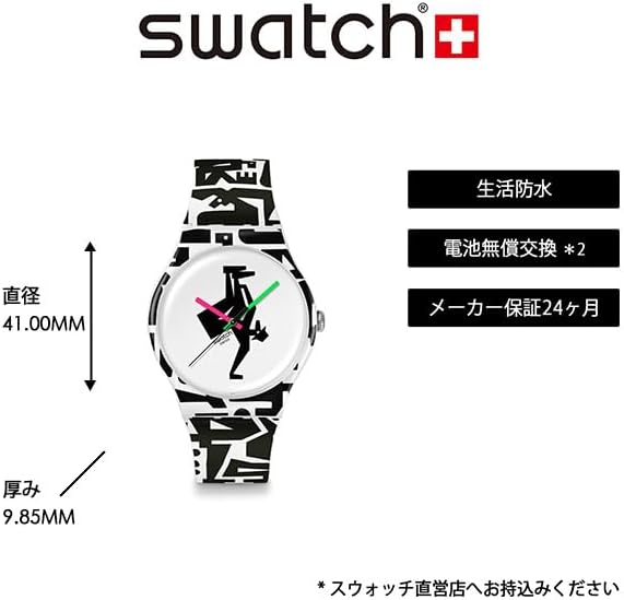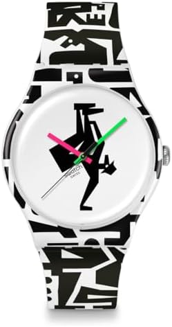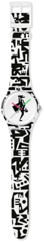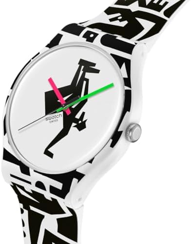 This fun watch is the result of collaboration with artist and graphic designer Grotesk. The white dial features a black stamped figure, pink hour hand, green minute hand and black second hand, all under a bio-based material glass. The figures printed in black extend through the strap, loop and case made of matt white bio-based material. Complete its look with a matte white buckle.
