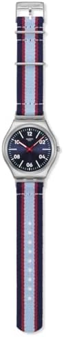 This ultra-thin watch has a dark blue dial with sun-brushed finish, silver rim, white printed indices and numbers and light blue printed minute track. The hour and minute hand are burgundy and glow in the dark. The sandblasted stainless steel case, loops and half buckle are complemented by a dark blue, burgundy and light blue striped textile strap.