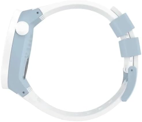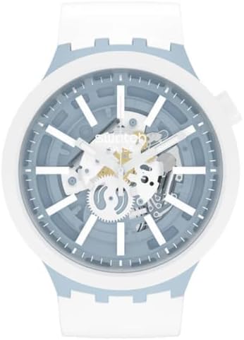 A matte white silicone strap and light blue loops star on this BIOCERAMIC watch. A clear printed dial and white hands with white Swatch Glow shine.