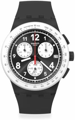 This stylish chronograph sports a sun-brushed black dial with red and black hour and minute hands that glow in the dark and a date window at 3 o'clock. It features a white bezel against a matte black case and matching strap, which is accented by a white loop and buckle.