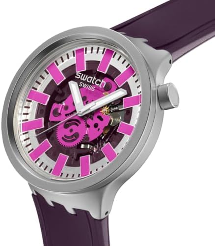 This oversized watch stands out for its transparent silver dial and features dark pink movement elements and indexes, dark lilac minute track, silver glow in the dark hour and minute hand, and silver seconds hand. The sandblasted stainless steel case with matching bezel and pusher is complemented by a matte dark lilac strap. This model includes loops in dark lilac and matte dark pink, as well as a sandblasted stainless steel half buckle.