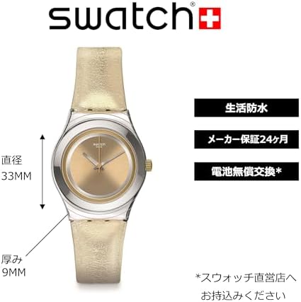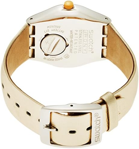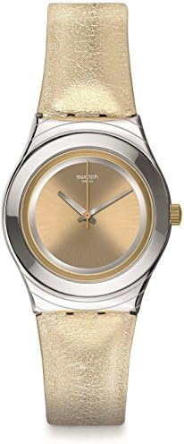 Brand Name Swatch Model number YLS190 Part Number YLS190 Model Year 2016 Item Shape Round Dial window material type Mineral Clasp Buckle Case material Stainless Steel Case diameter 33 millimetres Case Thickness 9 millimetres Band Material Leather Band width 16 millimetres Band Color Gold Dial color Gold Item weight 38 g Movement Quartz Display Type analogue
