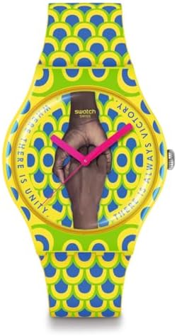 This fun watch is the result of collaboration with artist and photographer Thandiwe Muriu. The yellow dial features a multicoloured print and a pink hour, minute and second hand, all under a bio-based glass material. The multicoloured design is stamped on the strap and the matte yellow biobased material case. A matte light green loop and a matte yellow buckle complete its look.