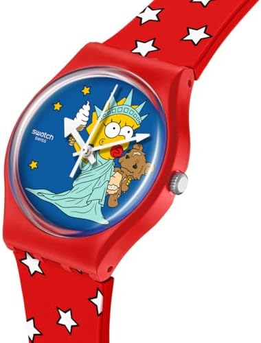 Included within the Simpsons collection, this fun watch celebrates the Fourth of July with the image of Maggie posing as the Statue of Liberty on the dial. This model features a matte red case covered by bio-based crystal, an equally red strap with white and blue star print, a dark blue loop with the Simpsons logo and a matching buckle.