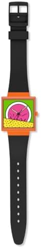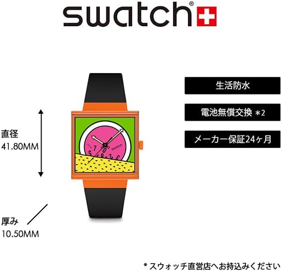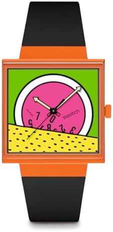 The BIOCERAMIC square matte orange watch case features a bio-derived edge to edge glass with multi-color design printed on the dial. Square multi-color dial with glow-in-the-dark black arrow hour and minute hands and black second hands. Matte black one-piece bio-derived strap, matching bio-derived loops and BIOCERAMIC buckles complement the dial and case. The back battery cover features a matte yellow print featuring Keith Herring Swatch logo. A Swiss watch that combines personality and practicality. Watch launched in 1983. The three keywords of "High Design", "High Quality", and "Reasonable Price" have gained universal popularity. Now it has grown to become a global brand. A collection that is linked with watches and fashions that reflect the trends, launches every season.