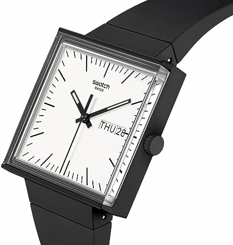 Brand Name Swatch Model number SO34B700 Part Number SO34B700 Item Shape Square Dial window material type Crystal Clasp Buckle Case material Stainless Steel Case diameter 33.25 millimetres Case Thickness 10.5 millimetres Band Material Bio-based materials Band width 4.7 millimetres Band Color Black Dial color White Calendar Date-Month Special features Glow In The Dark Movement Quartz Display Type Analog-Digital