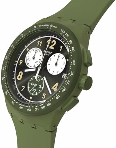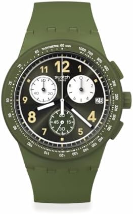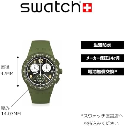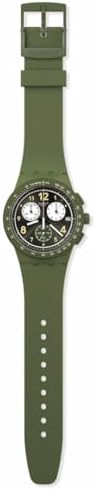 Brand Name Swatch Model number SUSG406 Part Number SUSG406 Item Shape Round Dial window material type Crystal Clasp Buckle Case material Metal Case diameter 42 millimetres Case Thickness 14.03 millimetres Band Material Silicone Band width 5.5 centimetres Band Color Green Dial color Green Calendar Date-Month Special features Chronograph Movement Quartz Display Type Analog-Digital