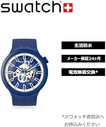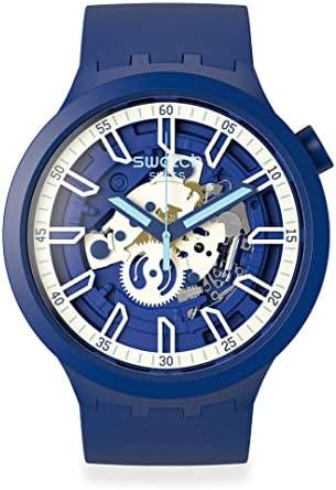 Transparent dial enhanced by blue hands. Blue plastic case with a blue silicone band. Quartz movement. 30 meters / 100 feet water resistance. Fixed bezel. Acrylic crystal. Solid caseback. Buckle clasp. Case size 44.00 mm x 12.00 mm. Swatch SB01N102 Iswatch Blue Watch.