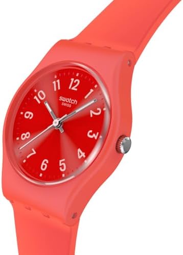Swatch watch is a vibrant and eye-catching fashion accessory. Its bright red plastic case and large, easy-to-read white dial stand out immediately. The red silicone strap gives a sporty and youthful look. This analog watch is perfect for anyone looking for a touch of color and style in everyday life. With its water resistance of up to 30 m, it is also suitable for light outdoor activities. Show off this Swatch watch to add some energy to your look!