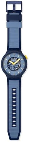 This oversized watch stands out for its light blue open dial with 3D printed white and yellow indices and glow in the dark yellow hour and minute hand, white seconds hand and light blue movement elements, all covered by bio-based crystal. The matte dark blue bio-origin case with same-color bezel is complemented by a matte dark blue strap with a matte light blue textured stripe, matte dark blue and light blue loops and half buckle in matte dark blue.
