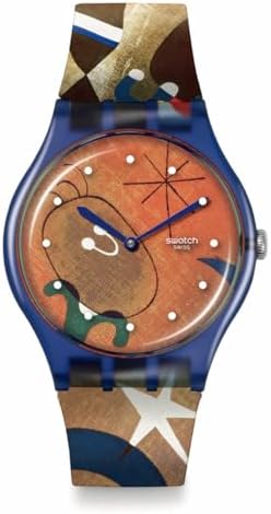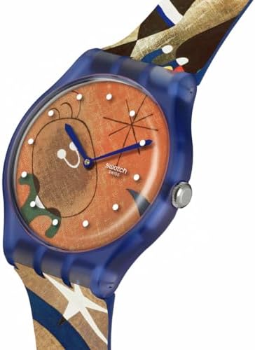 This Swatch x Tate Gallery collection watch features a clear matte dark blue bio-derived case and bio-derived glass with white printed indexes. The dial and transparent matte dark blue strap feature Joan Miró work, Women and Bird in the Moonlight with blue hour and minute hands. Clear mat loop has Tate Gallery logo printed Joan Miró Women and Bird in the Moonlight 1949. © Successió Miró/ADAGP, Paris and DACS, London 2024. Photo: Tate / © Tate A Swiss watch that combines personality and practicality. Watch launched in 1983. The three keywords of "High Design", "High Quality", and "Reasonable Price" have gained universal popularity. Now it has grown to become a global brand. A collection that is linked with watches and fashions that reflect the trends, launches every season.