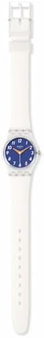 Brand Name Swatch Model number LE108 Part Number LE108 Item Shape Round Dial window material type Sapphire Crystal Clasp Buckle Case material Stainless Steel Case diameter 25 millimetres Case Thickness 7 millimetres Band Material Silicone Band width 2 centimetres Band Color White Dial color Blue Calendar Date-Month Special features Second Hand Movement Quartz Display Type Analog-Digital