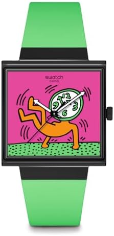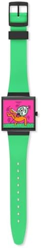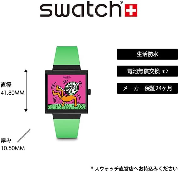 Square matte black BIOCERAMIC watch case features edge to edge glass with bio-derived material which is multi-color design printed on the dial. Square multi-color dial with glow-in-the-dark black arrow hour and minute hands and black second hands. Matte light green one-piece bio-derived strap with matte black bio-derived loop and matching BIOCERAMIC buckle complements the dial and case Matte white battery cover on back with multi-color print featuring Keith Herring Swatch logo. A Swiss watch that combines personality and practicality. Watch launched in 1983. The three keywords of "High Design", "High Quality", and "Reasonable Price" have gained universal popularity. Now it has grown to become a global brand. A collection that is linked with watches and fashions that reflect the trends, launches every season.