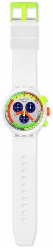 This oversized retro watch is inspired by a Swatch 90s chronograph - the JELLY STAG. Its distinctive features include a vibrant, multi-coloured dial with tachymeter scale complemented by orange hour and minute hands and a yellow second hand with glow in the dark effect. The watch has a clear matte case and bezel with orange crown and yellow buttons and bezel detail. The design is completed by a structured transparent matte strap with matching loops and a yellow half buckle.