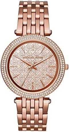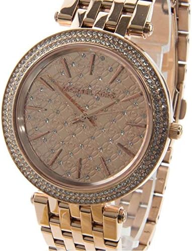 A beautiful 7-link bracelet and a sparkling crystal topring define the Rose Gold-tone steel Michael Kors Darci watch. An intricate Michael Kors logo pattern details the dial for a sophisticated finishing touch. Case Thickness: 7 mm; Case Size: 39 mm Band Width: 12 mm; Inner Circumference: 190 +/- 5 mm Band Material: Steel Water Resistance: 5 ATM.