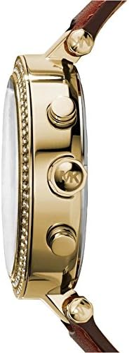 Taking consummate silhouettes and infusing them with glam contemporary touches, MICHAEL KORS watches for women are always in tune with the season and inspired by up to the minute styles that are ideal for the jet setter. For men, MICHAEL KORS timepieces provide paramount functionality in designs that combine performance, luxury and style. MICHAEL KORS women watch - Round stainless steel case (diam. 39 mm) in polished gold finishing - 2 gold pushers - 10 ATM water pressure resistance construction - Bezel with clear crystals Brown genuine leather strap with brown stitching - Buckle Gold dial with clear crystals as indexes, arabic number at 12 and inner bezel - Chronograph movement with date and 24h mode - Gold hands - Mineral glass.
