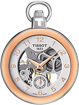 Skeleton Silver-tone dial enhanced by gold-tone hands. Rose Gold-tone stainless steel case.Hand Wind movement. 30 meters / 100 feet water resistance. Scratch Resistant Sapphire crystal. Case size 49 mm x 12 mm. Tissot T853.405.29.412.01 Pocket 1920 Watch.