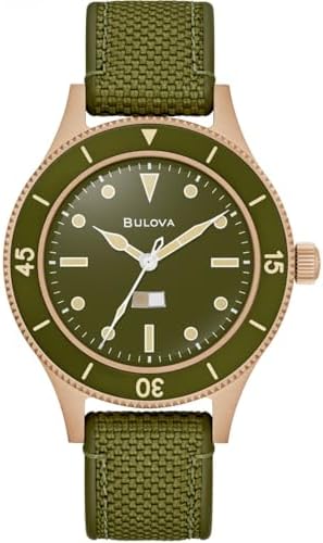Bulova Men's Time Only Watch from the Mil Ships 150Th Ann Collection. Special Edition . 41mm Bronze Case Watch The strap is made of cordura hnbr in green colour and with pin closure. The dial is with notched indexes. Movement: Automatic The water resistance is 20 ATM. Reference is 98A324