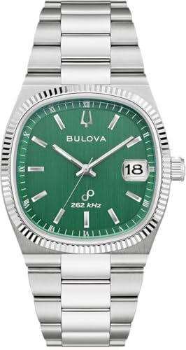 Inspired by the iconic 1970s Bulova Super Seville Day-Date, the new Super Seville blends vintage style with cutting-edge Precisionist technology. Its 38mm silver-tone stainless steel case suits most wrists, featuring a retro TV-shaped design that flows into an integrated 3-link bracelet with a push-button deployant clasp. A grooved coin edge bezel frames the flat sapphire crystal with a date magnifier. The striking green dial has a vertical brushed finish, polished hands and indices, and a date window at 3 o’clock. Powered by Bulova’s proprietary Precisionist movement—an 8-jewel quartz engine vibrating at 262kHz—it offers near-perfect accuracy, a smooth sweeping second hand, and superior resistance to temperature changes. The Super Seville is a seamless fusion of retro charm and modern performance, making it a refined yet bold choice for the contemporary wearer. Embrace timeless elegance with the men’s Bulova Super Seville.