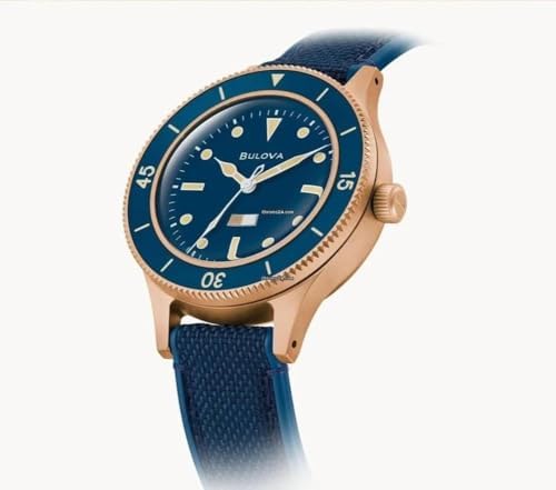 Bulova 150th Anniversary Watch Attractive Men's Bulova Archive Collection Automatic Winding Mechanical Movement 21 Stones Power Reserve Up to 60 Hours Dark Blue Dial Beige Luminescent Hands and Hour Points Central Second Hand Matte Bronze Case Blue Bezel with Beige Minute Scale Rotating Under Pressure Screw Case ththththththscrewed Logo, scratch-resistant, anti-reflective sapphire glass, dark blue silicone strap with textile surface, matte pin buckle, water resistant up to 20 bar, width (without crown) 41 mm, height 15.5 mm