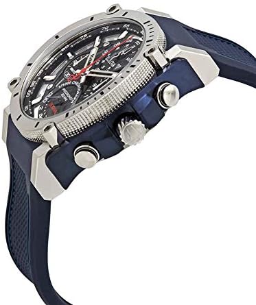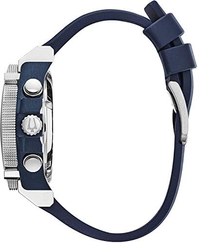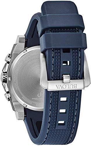 Powered by Bulova's proprietary Precisionist eight-hand quartz chronograph movement with a 262kHz vibrational frequency”eight times greater than standard timepieces”for unparalleled accuracy. Stainless steel and blue IP steel screw-back case with screw-down crown, black carbon fiber chronograph dial with date feature and red accents, curved mineral crystal, textured blue polyurethane strap with three-piece buckle closure, and 300-meter water resistance.