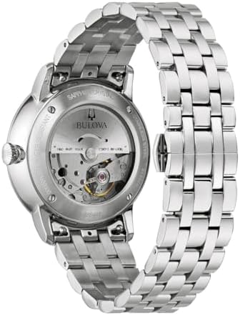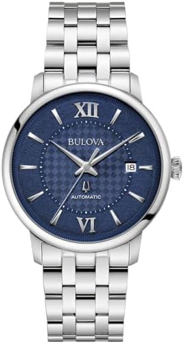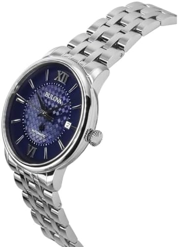 The new Bulova Hudson is a refined dress watch blending classic elegance with modern design. Its 39mm silver-tone stainless steel case features a sculpted, convex profile with soft contours, a double-domed sapphire crystal, onion-shaped crown, and curved lugs for a comfortable fit. The navy blue dial showcases four rich textures, centered by a striking basketweave pattern. Arched Roman numerals at 6 and 12, baton hour markers, a date window at 3, and polished silver-tone hands complete the elegant layout. Powered by an automatic movement with 21 jewels and a 42-hour power reserve, it offers both beauty and performance. The watch is paired with a matching silver-tone stainless steel bracelet and deployant clasp for a seamless, secure fit. With its sophisticated presence and exceptional craftsmanship, the Bulova Hudson is your next essential timepiece.