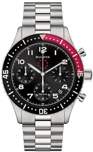 Bulova men's chronograph watch from the Marine Star 150Th Ann collection. Special Edition . 43mm steel case watch. The strap is made of coloured steel and has a folding clasp. The dial is with Arabic numerals indexes. Movement: 262KHz Precisionist Quartz The water resistance is 20 ATM. Reference is 98B451