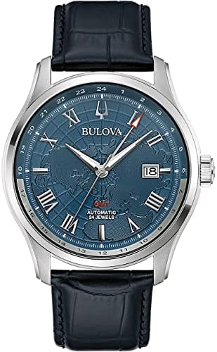 This traditionally designed watch features an innovative new automatic movement with the ability to adjust the hour hand to a different time zone without compromising accuracy while traveling anywhere in the world and the dual time can be read at a glance. The sophisticated design of the silver-tone stainless steel case presents a blue GMT dial with 4 hands, a calendar, Roman numerals and an anti-reflective, domed sapphire crystal. The luminous tip of the GMT hand is framed in a shade that matches the colour of the GMT" printed on the dial and, together with the two-tone dial ring with 24-hour display, marks the second time zone. The dial shows a world map showing the land in a groove structure, while the coordinates of longitude and latitude are also above the sea. The black embossed alligator leather strap with tone-on-tone stitching, nubuck lining and double press deployment clasp completes the elegant appearance. The automatic movement with 24 stones guarantees optimal performance and has a power reserve of 42 hours. This makes this watch the ultimate timepiece for world travellers and lovers of fine watches alike. Water resistant to 30 metres.