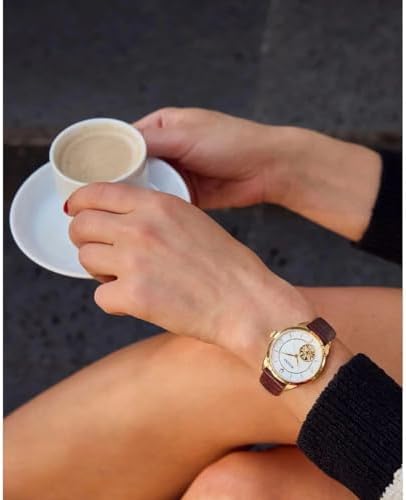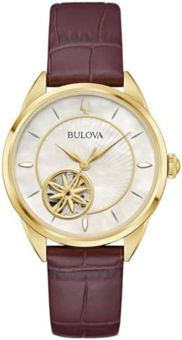 Unparalleled in refinement and timeless in design, this Bulova women’s timepiece introduces a new automatic watch from the Sutton Collection that will elevate your style. The watch features a 34mm gold-tone case with a domed sapphire crystal with anti-reflective coating and is paired with a brown leather strap with a pin-buckle closure. The lustrous mother-of-pearl dial features a sunray pattern, gold-tone hour markers and hands, and a floral aperture revealing the heart of the 21-jewel automatic movement, also visible through a transparent case back, which has a power reserve of 42 hours. This Bulova ladies’ watch is made for those with an eye for style who aren’t afraid to make a statement.