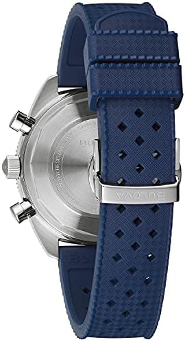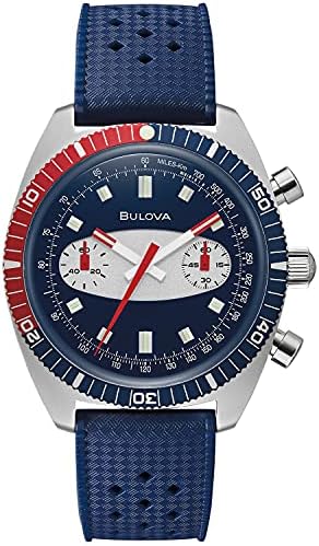 A style inspired by history, the Chronograph A is a nod to the popular styles from Bulova’s diver chronographs from the 1970s. This style was popularly known as the “Surfboard” for the distinctive blue oval “surfboard” encircling the two sub dials. This updated version features a stainless steel case with blue and red accents and a blue dial. The dial features the notable oval in white around the sub dials, as well as red tipped hour and minute hands, luminous hands and markers, and a red chronograph second hand. Five-hand chronograph quartz movement, domed sapphire crystal with anti-reflective coating. Blue perforated silicone strap with deployant closure. Water resistance to 200 meters. Double Curved Sapphire Box Crystal Chronograph, 5 Hand