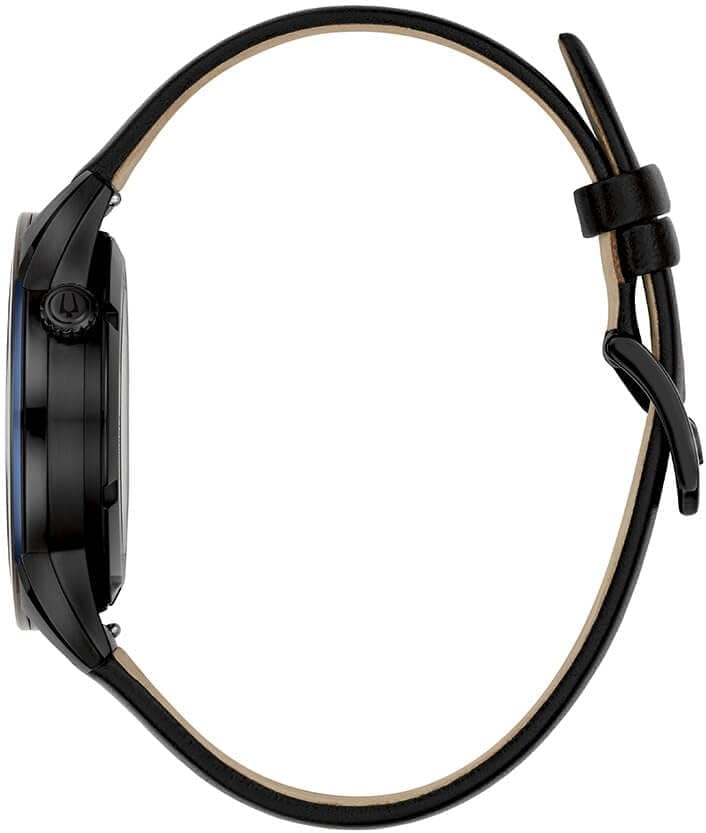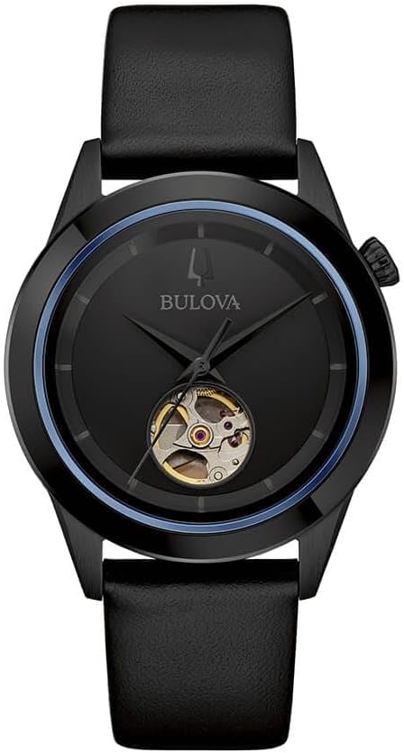 Bulova Men's Time Only Watch from the Modern Collection. Watch with 40mm black IP steel case. The strap is made of black leather and has a pin clasp. The dial is with notched indexes. Movement: Automatic The water resistance is 3 ATM. Reference is 98A323