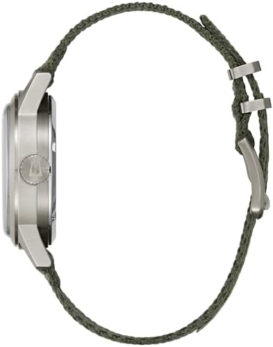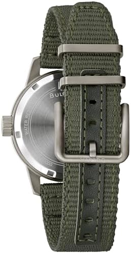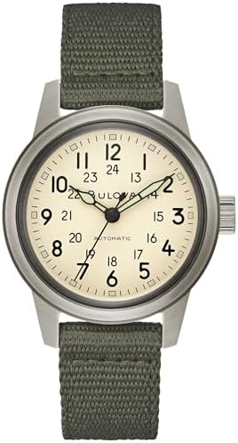 Inspired by Bulova’s military heritage and vintage watches of the time, the Hack Watch infuses historical elements for a contemporary lifestyle. Just like its predecessors, the black PVD-coated stainless steel case features a domed mineral crystal and oversized crown. The ivory dial provides contrast and is accented with luminescent hands and markers, plus a center track on the dial displaying 24-hour time. Fitted with a durable green nylon strap and powered by a 21-jewel automatic movement with a 42-hour power reserve, this vintage-inspired men’s Bulova timepiece is stylish enough for any occasion and rugged enough for every adventure.