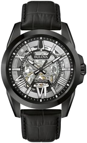 Bulova Classic Collection with a long history of over 145 years. It is centered on the automatic mechanical movement and has a timeless, elegant and beautiful sophisticated timepiece. From the popular CLASSIC, this model features a skeleton at the center of the dial with new color variations has been added. Black PVD case with black calf gives an overall chic look. Caliber: 8N24 / Operating Time: 42 hours (maximum winding) / Accuracy: -20 to +40 seconds / day/ Number of Stones: 21 stones / 10 ATM water resistant.