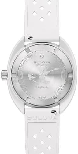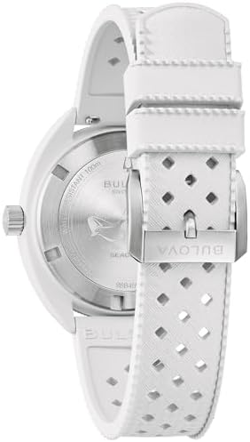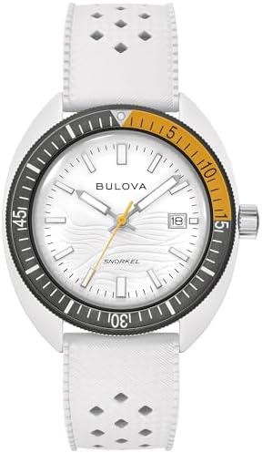 Continuing Bulova's tradition of innovation and fine craftsmanship, the new Snorkel collection blends vintage-inspired design with a fresh, modern twist. The reimagined Bulova Snorkel shares DNA with the iconic Oceanographer through its classic yet recognizable case shape. In hues inspired by marine life, each 41mm timepiece features a retro case shape made with an innovative Hybrid Ceramic-a lightweight composite material that feels luxuriously smooth with enhanced durability. This model's wave-pattern white dial and striking white hybrid ceramic case pair perfectly with a gray unidirectional bezel with a bi-color insert and a case back etched with an image of a sea gull, paying homage to its oceanic roots. With silver-tone hands and markers with luminescent fill, a date display, and a matching white perforated rubber strap, the Snorkel embodies timeless design, and with 100m water resistance, it perfectly balances style and functionality with Bulova's legacy of iconic watchmaking.