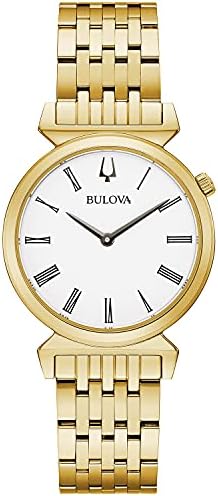 Inspired by Bulova heritage timepieces, the gold tone stainless steel Regatta features slim Roman numeral markers on a white dial, the crown at the 2 o'clock position, and unique angled lugs. Flat sapphire crystal, slim quartz movement, and water resistance to 30 meters. Sapphire Crystal 2 Hand, Slim Movement
