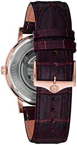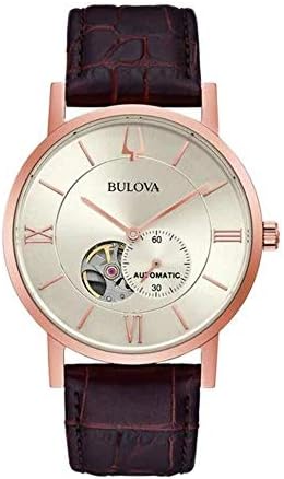 Bulova men's automatic watch from the classic clipper collection. Watch with steel case diameter 42 mm. Brown coconut print leather strap with pin closure. Total length of the strap is 25 cm including case and 21 cm without case. Notch markers. Water resistance of 3 ATM. Automatic movement Reference is 97a150