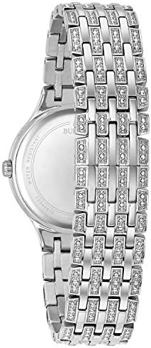 Web exclusive! When it's your time to shine, be sure to wear the Bulova women's silvertone crystal Swarovski watch. This timepiece is embellished with 440 Swarovski crystals on the bracelet, bezel and full-pav= dial, creating a dazzling display ideal for upscale events. A fold-over closure keeps this women's stainless steel watch securely in place, while the water-resistant design offers peace of mind.