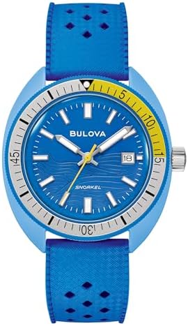 Bulova Men's Time Only Watch from the Snorkel Collection. Watch with 41 mm bio ceramic case. The strap is made of rubber and cordura blue with pin closure. The dial is with notched indexes. Movement: Quartz. The water resistance is 10 ATM. Reference is 98B445