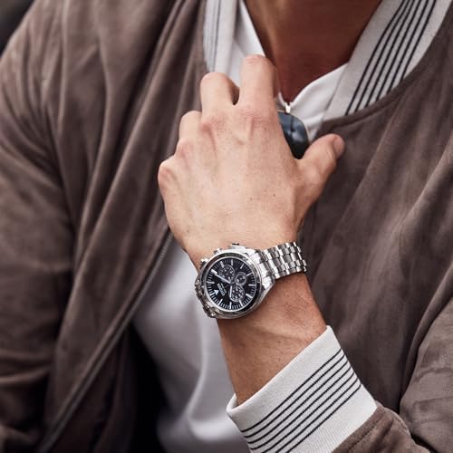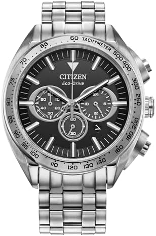 Designed to be versatile featuring a stainless steel case with 3-piece construction and a black dial with date, 12/24-hour time, a chronograph that measures up to 60 minutes, a tachymeter, and sapphire crystal. The stainless-steel bracelet features a fold-over clasp with push buttons for easy accessibility. Water-resistant up to 100 metres and featuring Citizen’s sustainable Eco-Drive technology powered by any light that never needs a battery, this striking men’s watch transitions seamlessly from day into evening with style.