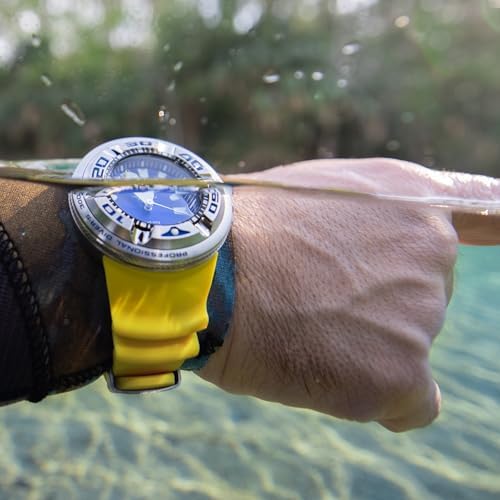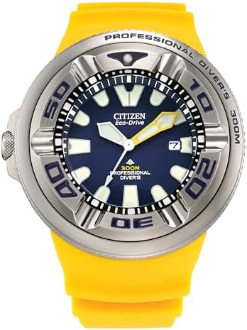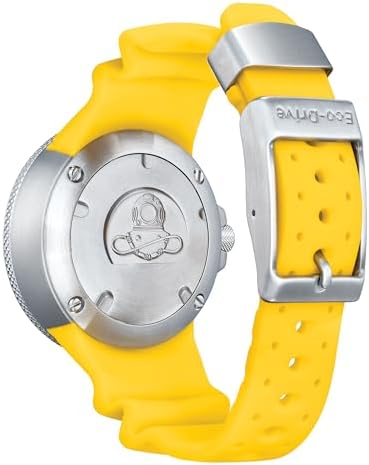 Explore the deepest depths with the Promaster Diver ‘Ecozilla’ with water resistance up to 300 metres. This bold high-performance ISO-compliant dive watch is reimagined from a fan favourite and features striking details that will stand out on your wrist. Featuring a silver-tone stainless steel case, a dark blue 3-hand dial with luminous hands and markers for superior legibility, and a durable, yellow polyurethane strap for lightweight comfort. Featuring a one-way rotating elapsed time bezel, screw-back case and crown and completed with an engraving of a diving helmet on the case back. Sustainably powered by light with Eco-Drive technology and never needs a battery, this ultimate dive watch comes in a scuba tank-inspired box for the serious diver and collector.