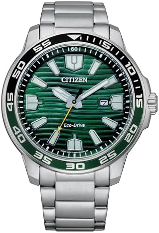 Stand out from the crowd with this Men's Sport from Citizen, featuring a green dial with a unique pattern offering a bold look. The look is completed with a green and black bezel and stainless steel bracelet. Date display, luminous hands and markers and water resistance to 100 metres. Featuring with Eco-Drive technology, this watch is powered by light and never needs a battery.