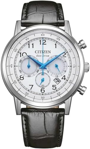 This Citizen Of collection CA4630-02A Chrono oriented watch for men, has a steel case with circular shape. The strap is black leather . White dial. Spherical mineral crystal, Eco Drive B620 movement with 9 months power reserve and analog display. Water resistance: 5 ATM. Diameter: 42 mm. Functions: Chronometer 60 minutes to 1/5 of a second, three hands and calendar. Weight: 75 gr. Belongs to the collection: Of collection. Enjoy your Citizen watch.