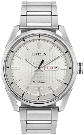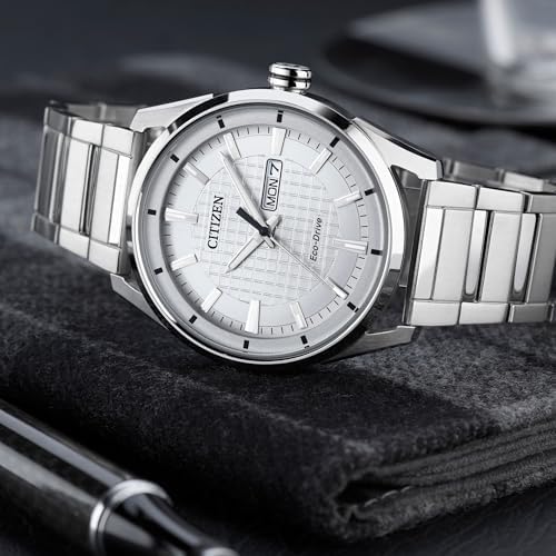A classically modern design. This Men's Bracelet from Citizen is featured in stainless steel with a silver-tone dial and day/date display. Featuring Citizen Eco-Drive technology - powered by light, any light. Never needs a battery.