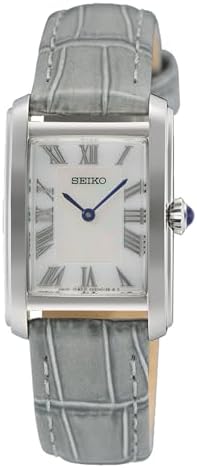 The Seiko SWR099P1 is a classic quartz ladies' watch with a refined design. It features a stainless steel case paired with a leather strap, offering both durability and elegance. The watch is powered by a Quartz movement (Caliber 4N30) and has a water resistance of 5 bar, making it suitable for everyday wear. Its white, mother-of-pearl dial with Roman numerals adds a timeless touch, while the curved Hardlex glass enhances durability.