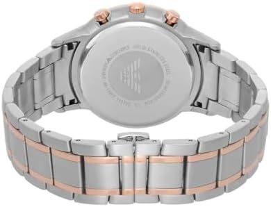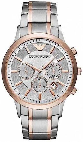 The Men's Stainless Steel & Rose Gold Chronograph Emporio Armani Watch AR11077 is a fantastic men’s watch. This watch has a 43mm stainless steel case with a chronograph display. The watch has a silver dial with a stainless steel strap and is powered by Quartz movement. The watch is water resistant up to 50 meters.Men's Stainless Steel & Rose Gold Chronograph Emporio Armani Watch AR11077Chronograph DisplayQuartz MovementSilver Dial43mm Stainless Steel CaseWater Resistant Up To 50 MetersStainless Steel Strap