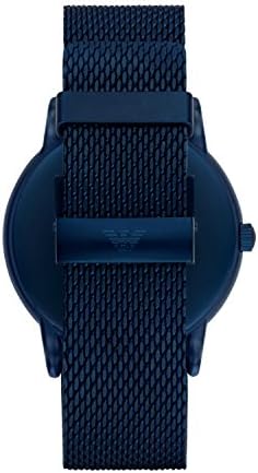 EMPORIO ARMANI men watch - Blue round stainless steel case (diam. 43 mm) in matte finishing - 5 ATM water pressure resistance Blue stainless steel mesh bracelet - Double locking clasp with push button and adjustable sliding clasp White dial with blue indexes and eagle logo - 3 hand movement with date - Blue hands - Mineral glass The design of the Emporio Armani boxes is always different and changes with each season Packed in EMPORIO ARMANI gift box