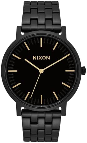 Nixon Porter watch. Forward in thinking but rooted in traditional style, The Porters bold printed dial makes a statement without all of the excess. 3-hand movement and crown placement at 3 o'clock. Clean and considered with a 40mm case. Printed hour indices with a stamped seconds track. Custom solid stainless steel free-swing 5-link band with solid stainless steel double pusher clasp. Imported.